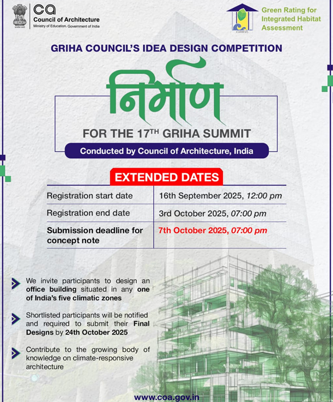 As a part of the 17 GRIHA Summit, GRIHA Council with association with Council Of Architecture (COA) is organizing an idea design competition ‘Nirmaan’. This design competition invites participants to design an office building situated in one of India’s five climatic zones — Hot-Dry, Warm-Humid, Composite, Temperate, or Cold.